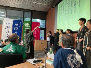 開会は午後4時。北海道恵迪寮同窓会の内藤春彦会長の開会挨拶、お忙しい中駆けつけてくださった髙橋彩北海道大学理事・副学長の来賓挨拶、参加者全員での「都ぞ弥生」1・2番の斉唱と開会のプログラムは進行しました。ここで、今回の参加者の中から北大女子寮出身でご主人が恵迪寮同窓会設立にも尽力された故岡部賢二君(155期寮長)のご令室である岡部潔子様(S33北大入学)からの特別スピーチがありました。そして、東日本恵迪寮同窓会の坂倉雅夫会長による乾杯で寮歌祭はにぎやかに始まりました。