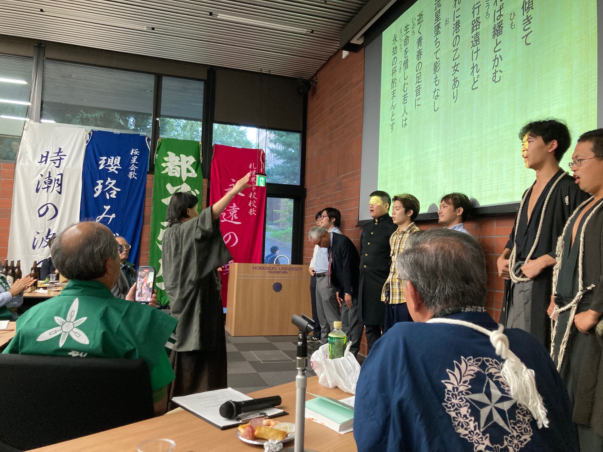 「シンポジウム」に引き続き、従来のクラーク会館ではない会場となった「百年記念会館 大会議室」で、北海道大学から2名、道外から駆けつけてこられた3名、小樽商科大学関係者6名、現役寮生15名を含めた多彩な参加者55名を得て、「寮歌の集い」を行いました。