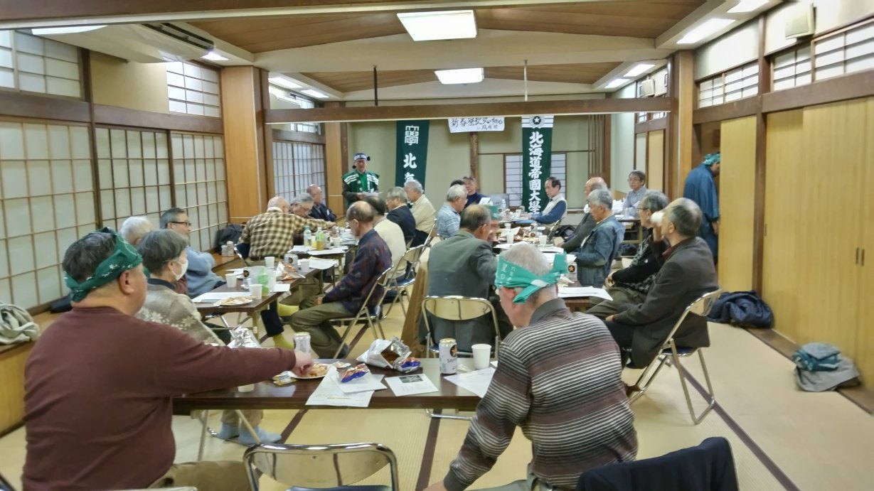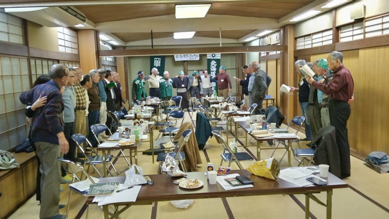 坂倉会長の新年の挨拶のあと、1人=1分で自己紹介。その後、好きな寮歌を参加者が次々と歌っていく形式で進行しました。M44藻岩の緑、S35茫洋の海、T9桜星会歌瓔珞磨く、T12春雨に濡る、S39偉大なる北溟の自然、S8タンネの氷柱、水産放浪歌、S21時潮の波の… 今回も2時間余りの楽しい歌い初めの会は、あっという間でした。最後は「都ぞ弥生」の斉唱と(S46)木村成二氏のエールで締めました。